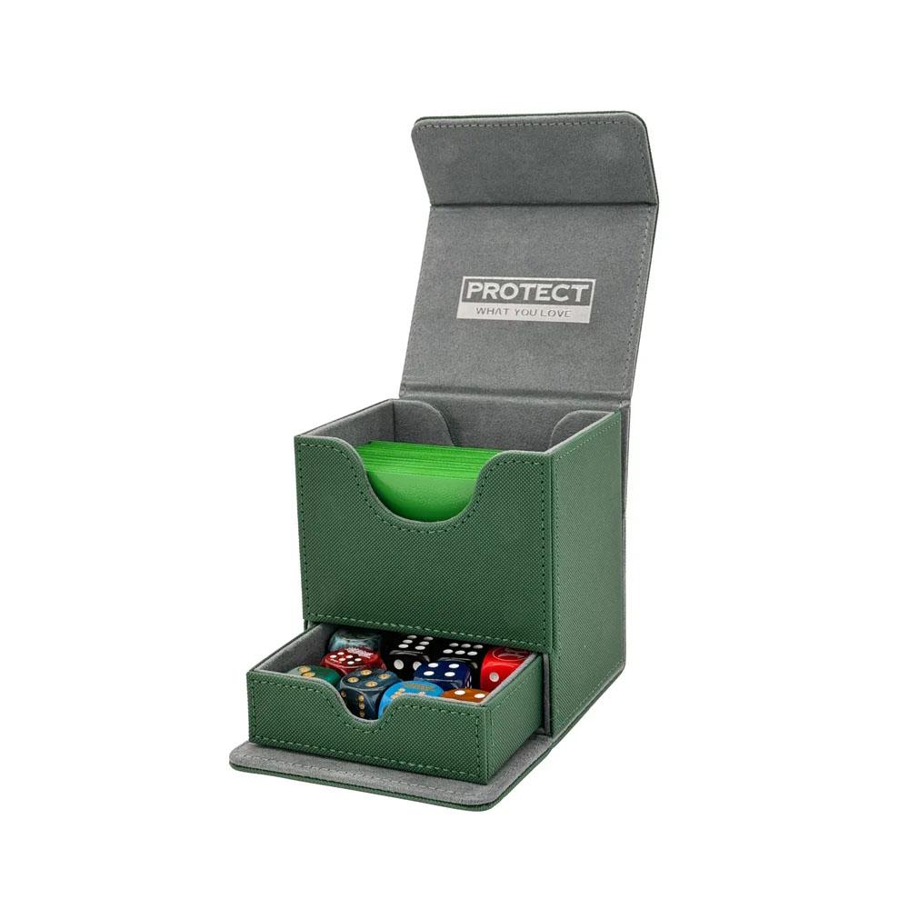 Mit robustem PU-Leder, bietet Platz für mehr als 100 Sammelkarten und verfügt über ein Innenleben aus Mikrofaser für eleganten Schutz. Durch den extra starken Magnetverschluss wird Ihre Sammelkarten Sammlung sicher gehalten. Zusätzlich verfügt die Deckbox über ein Fach für Würfel.