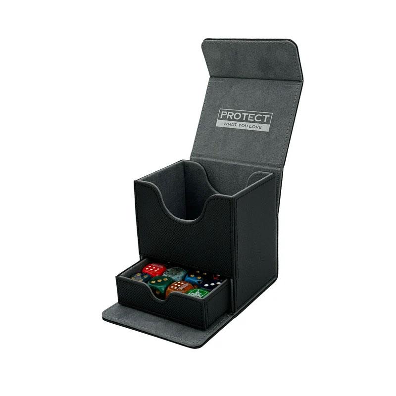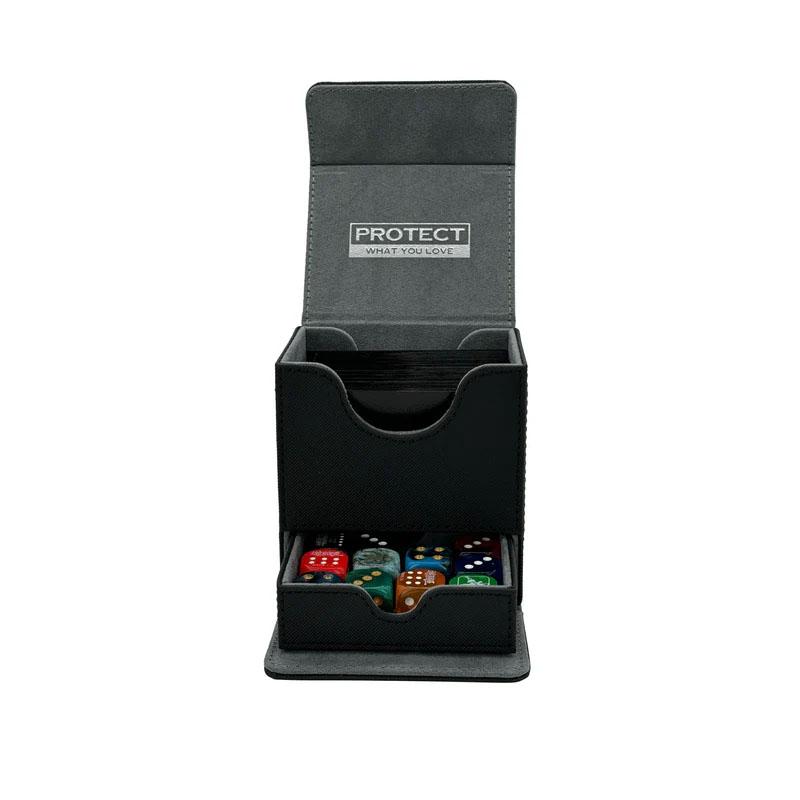 Mit robustem PU-Leder, bietet Platz für mehr als 100 Sammelkarten und verfügt über ein Innenleben aus Mikrofaser für eleganten Schutz. Durch den extra starken Magnetverschluss wird Ihre Sammelkarten Sammlung sicher gehalten. Zusätzlich verfügt die Deckbox über ein Fach für Würfel.