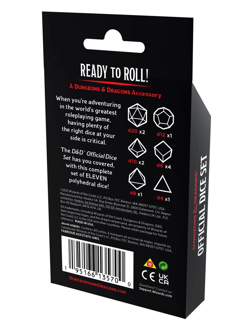 When it comes to adventuring in the world’s greatest role playing game, having plenty of the right dice at your side is critical. Whether you're exploring jungles, sailing seas, or navigating wild frontiers, this Official D&D Dice Set will help roll you through it. The D&D Official Dice Set has you covered with this complete set of eleven polyhedral dice!