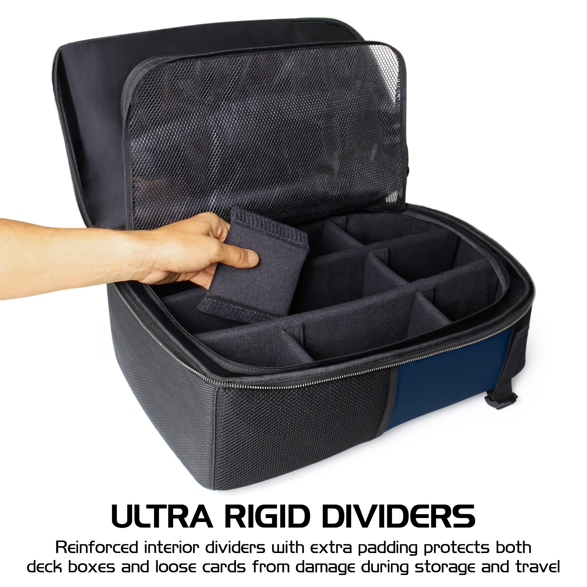 The MTG Card Backpack features a premium interior complete with reinforced dividers that can be organized to accommodate your gaming card collection and any larger accessories you have. This highly customizable interior is perfect for storing loose cards, sleeved cards, BCW boxes, deck boxes, and commander decks. The rugged design protects your cards and accessories from drops, scrapes, and more, and has a line of built-in padding making the ENHANCE Playing Card Holder a perfect storage and travel bag.