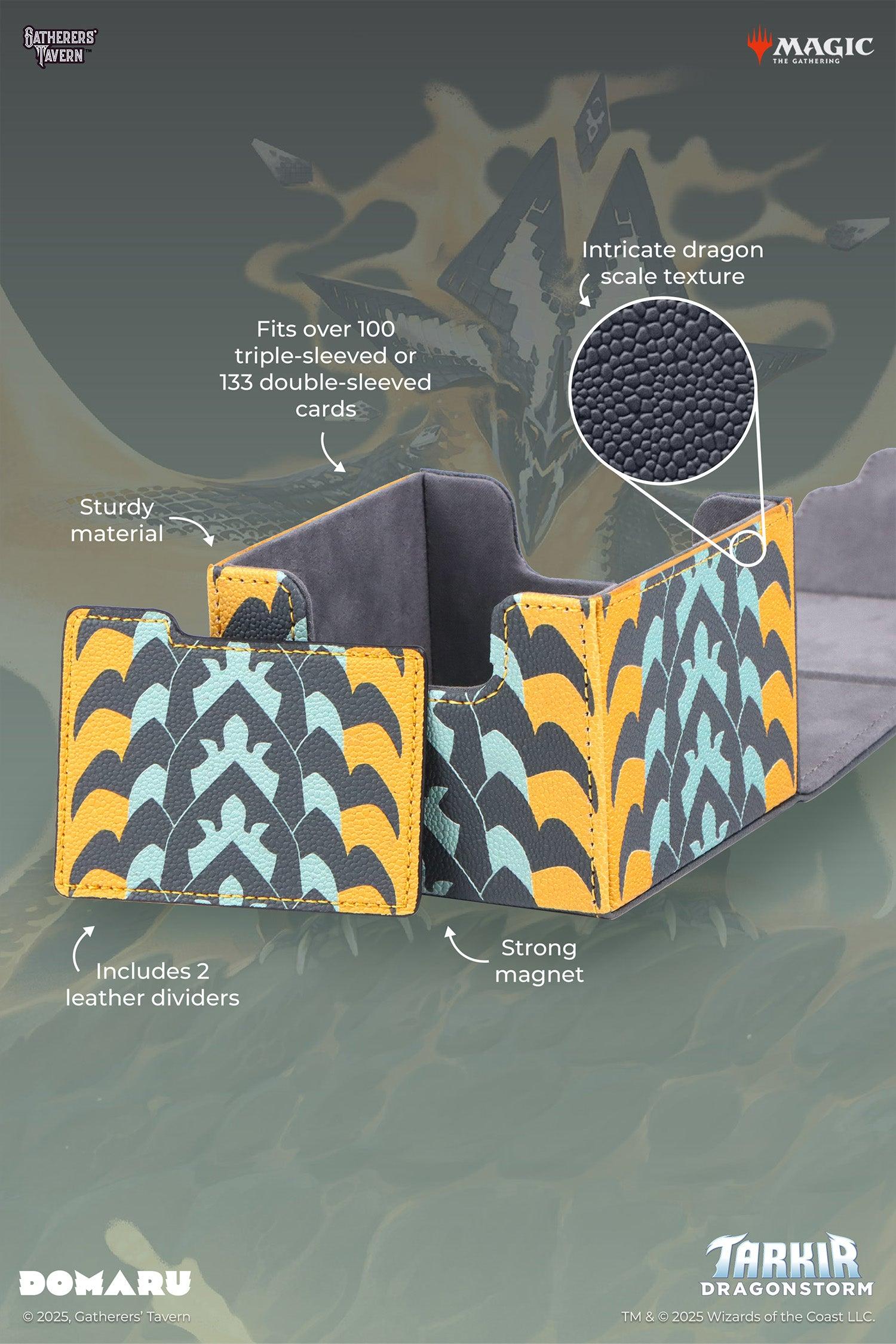 Tarkir: Dragonstorm Inspired Design: Featuring textured scale patterns of the five dragons, the Tarkir: Dragonstorm DOMARU Box is the perfect way to showcase your love for the set.