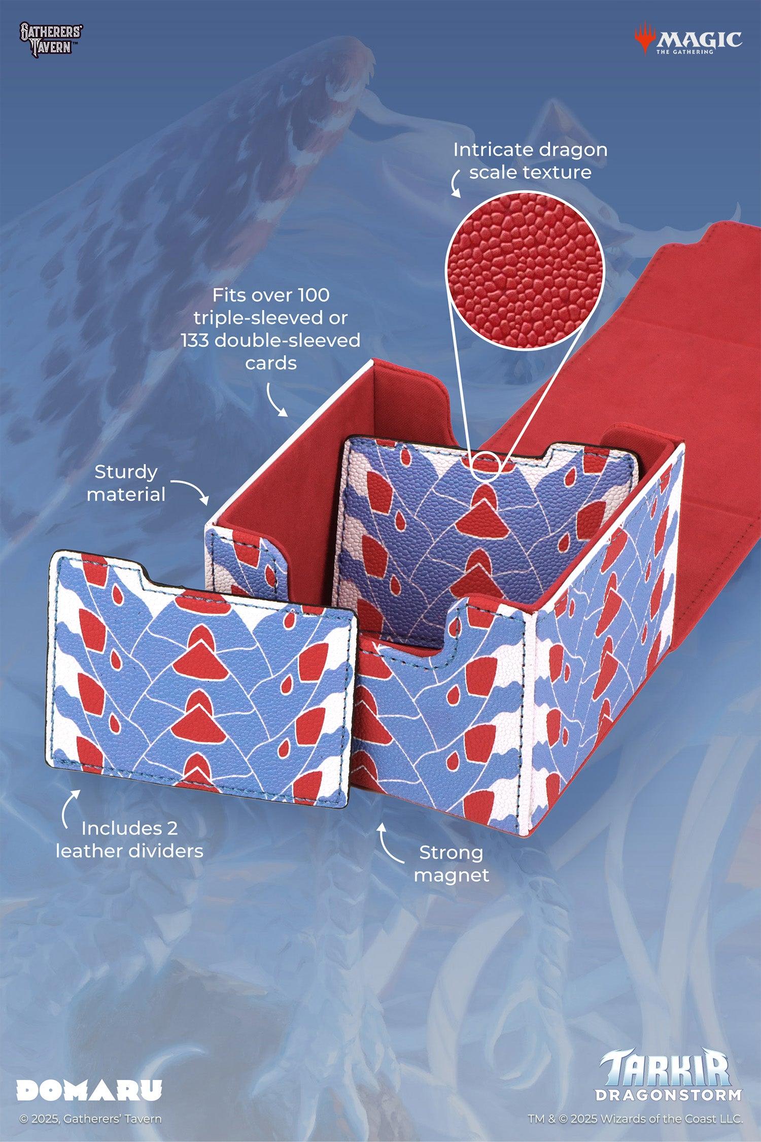 Tarkir: Dragonstorm Inspired Design: Featuring textured scale patterns of the five dragons, the Tarkir: Dragonstorm DOMARU Box is the perfect way to showcase your love for the set.
