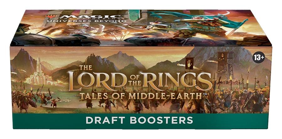 The Lord of the Rings: Tales of Middle-earth Draft Booster Box contains 36 The Lord of the Rings: Tales of Middle-earth Draft Boosters and 1 Traditional Foil Box Topper card. Each Draft Booster contains 15 cards and 1 token/ad card or Helper card, including 1 card of rarity Rare or higher and 3 Uncommons, 10 Commons, and 1 Land cards. Traditional Foil Borderless Mythic Rare card in <1% of boosters. Traditional Foil of any rarity replaces a Common in 33% of boosters. This product does not contain Serialized Ring cards including the Serialized Elven, Dwarven, or Human Sol Ring cards, and The 1 of 1 Ring (Serialized 001 of 001). Serialized Elven, Dwarven, and Human Sol Ring cards can only be found in some The Lord of the Rings: Tales of Middle-earth Collector Boosters. Only one card has been printed of The One Ring (Serialized 001 of 001), and this card can only be found in one English-Language Collector Booster. Non-serialized Ring cards are mechanically identical to their Serialized versions.