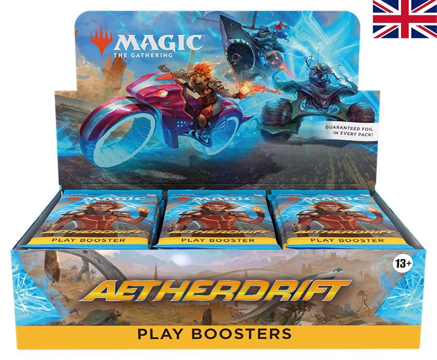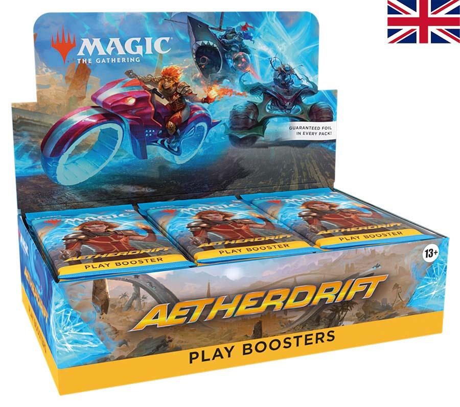 Start your engines for a high-octane death race across the Multiverse! Swerve through three planes of mayhem, dodging dangerous obstacles and rival racers along the way. This Aetherdrift Play Booster Box containing 30 Play Boosters, perfect for both Limited play and opening packs just for fun. Each Play Booster contains 14 Magic: The Gathering cards and 1 Token or Art card, including 14 cards of rarity Rare or higher and 35 Uncommon, 69 Common, and 1 Land cards. 1 card of any rarity is Traditional Foil. A Traditional Foil Land replaces a Land in 20% of boosters.